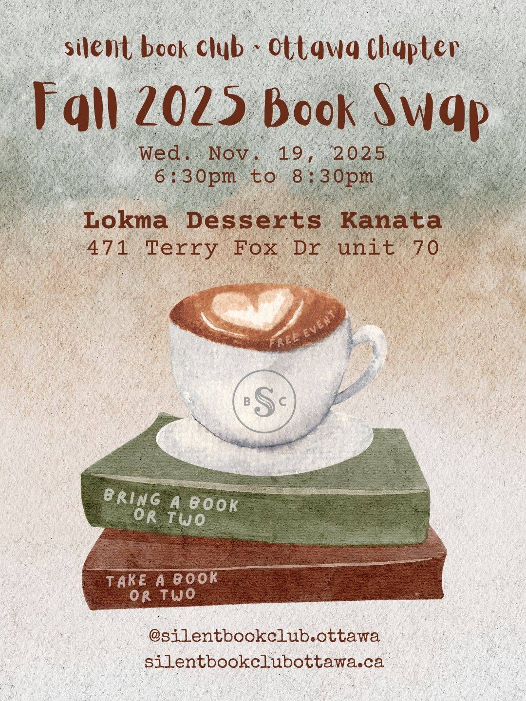November 2025 ~ Book Swap Edition You are cordially invited... Fall 2025 Book Swap🍂 Wednesday, November 19th, 20256:30 – 8:30pm Lokma Desserts Kanata471 Terry Fox Dr unit 70 Fall Book Swap: A Cozy Exchange of Stories As the crisp air and vibrant colors of autumn settle in, it's the perfect time to cozy up with a good book. Join us for our Fall Book Swap, where book lovers of all kinds can gather to exchange their gently-loved reads and discover new favorites. Whether you're into thrillers,...